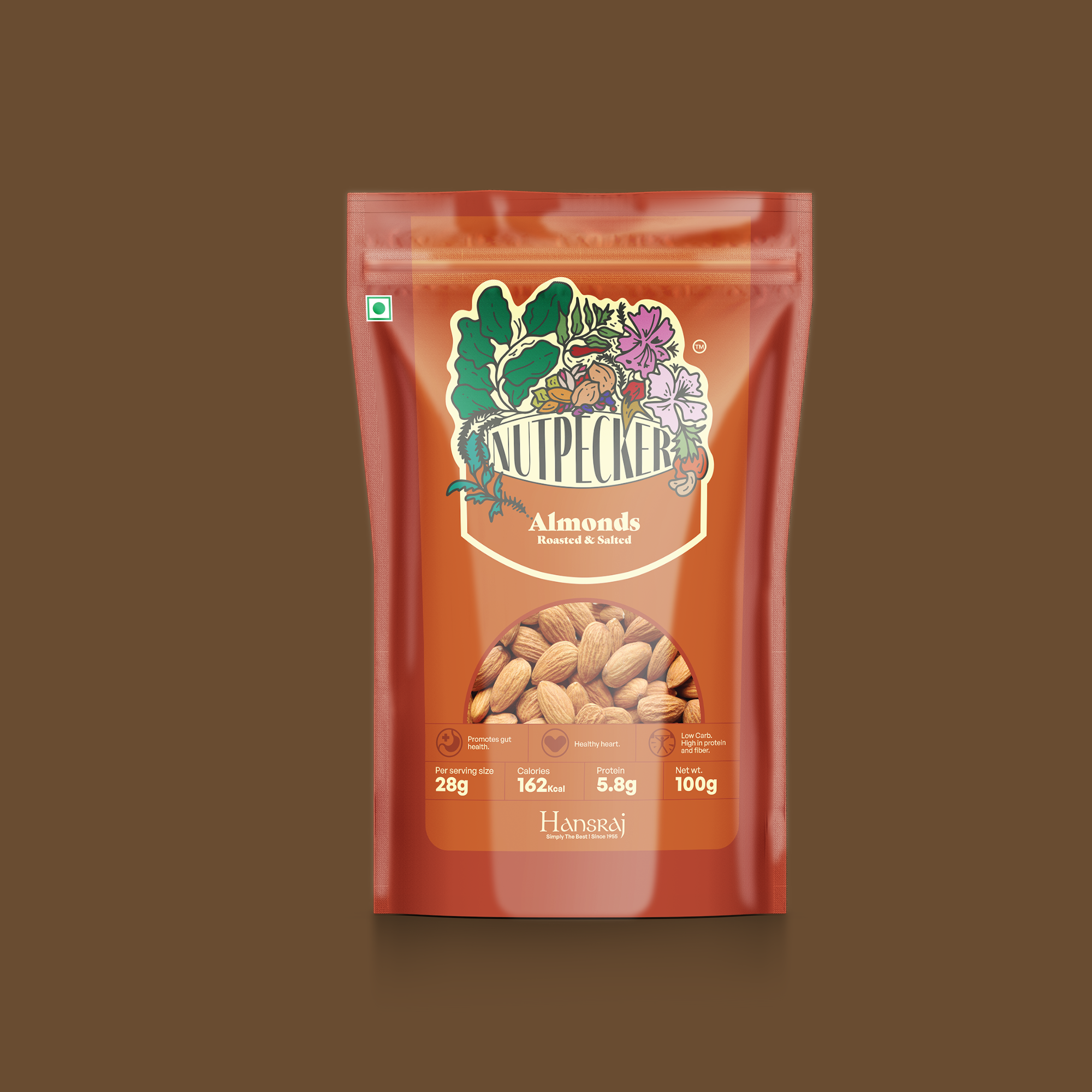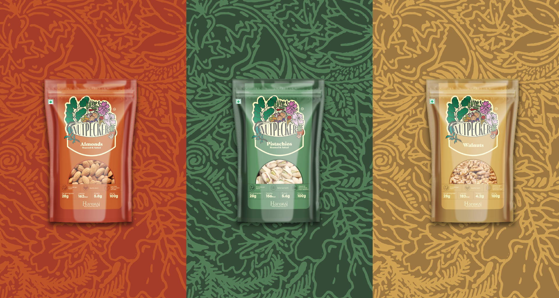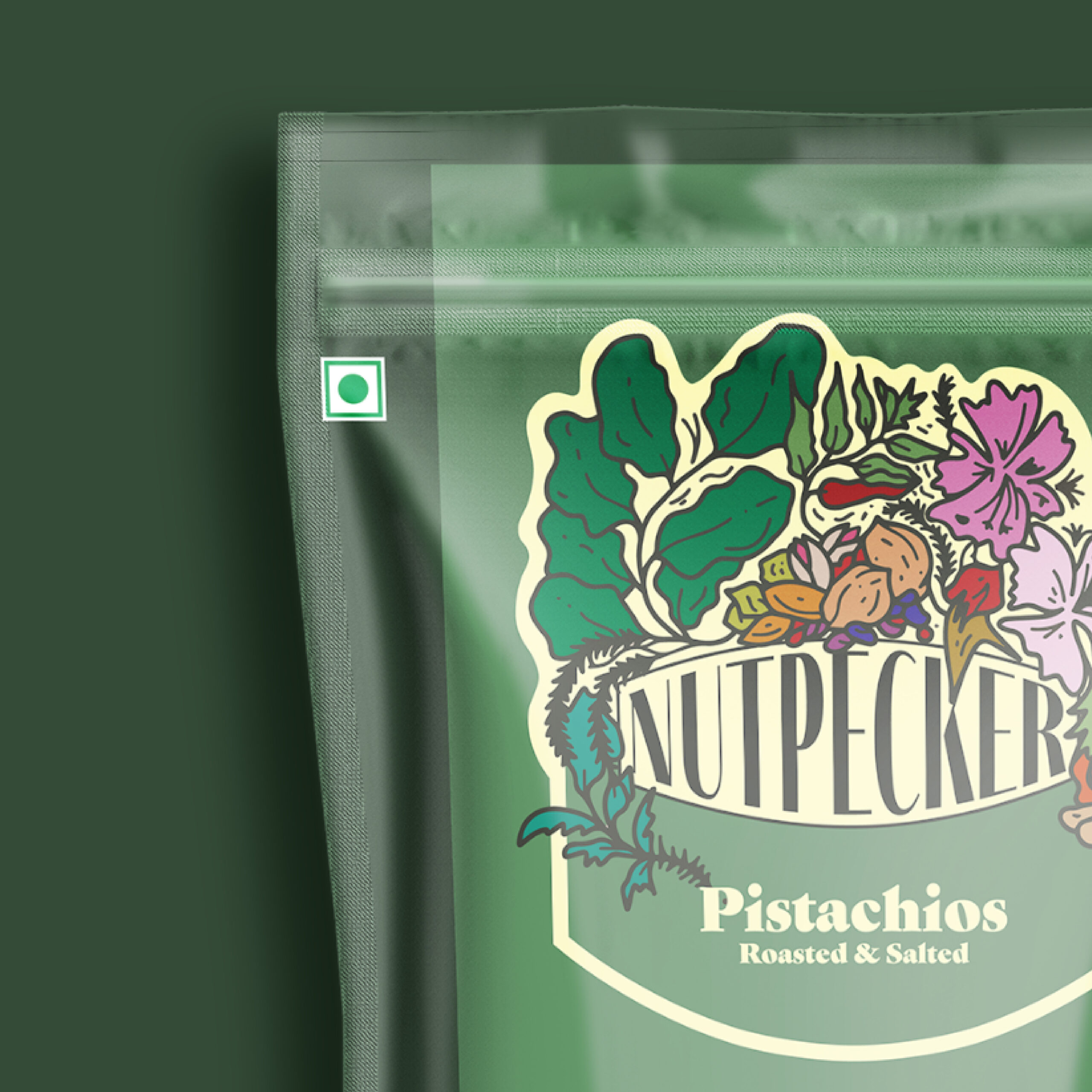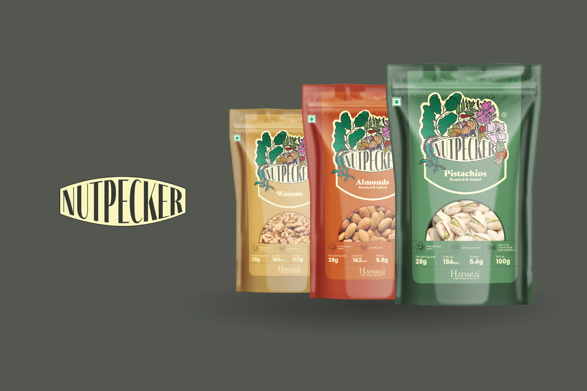 We proposed the name 'Nutpecker', for its quirkiness and sticky nature. The vividly floral and leafy logo speaks of the multiple ecosystems from where these nuts are sourced and the experience that is brought to the buyer every time they peck the delicious nuts packed inside.